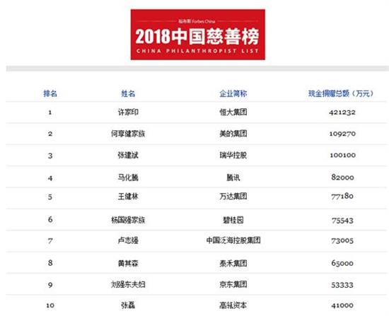 7月31日,《福布斯》发布2018中国慈善榜,星空在线-【官网】董事局主席许家印以42.1亿元的现金捐赠金额雄踞榜首,捐赠金额占榜单总额的四分之一,继2012、2013年后第三次成为中国首善。